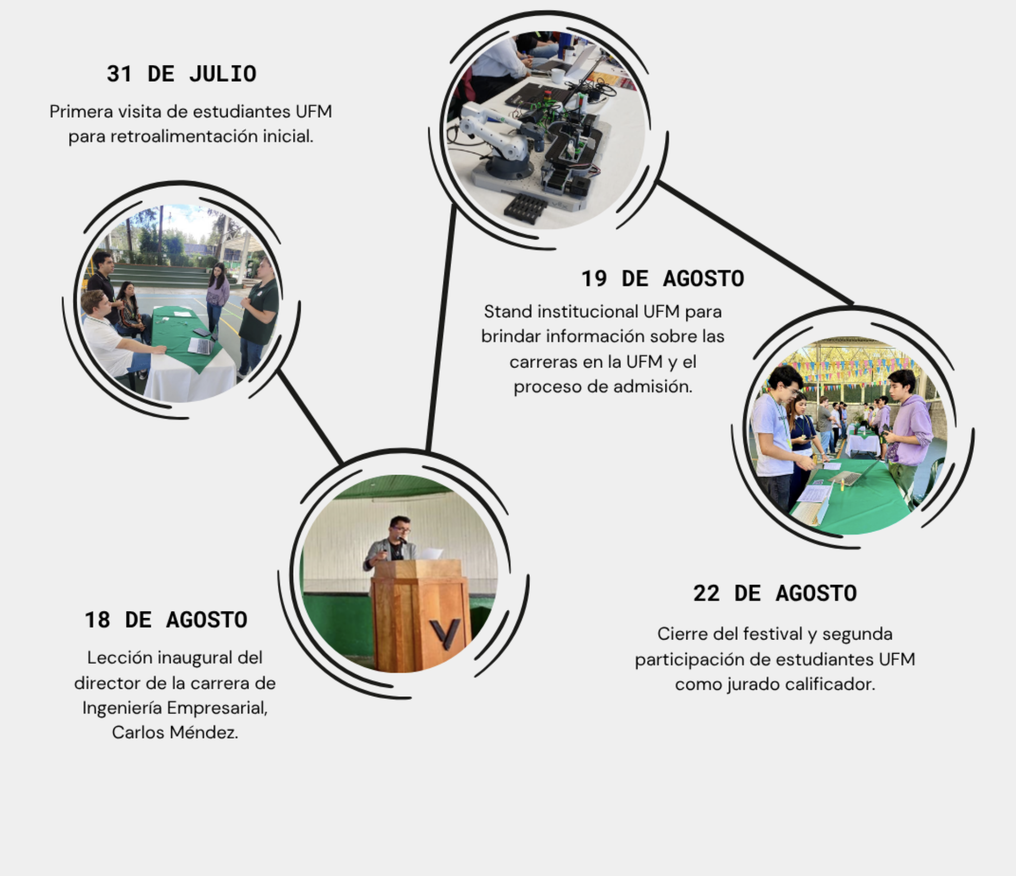 El 31 de julio y el 22 de agosto del 2025, un grupo de estudiantes de las carreras de Ingeniería Empresarial y de Computer Science de la UFM visitó el colegio para evaluar proyectos escolares enfocados en ideas de negocio. La dinámica se desarrolló como una feria: los estudiantes del colegio montaron estands para presentar prototipos e iniciativas diseñadas como soluciones viables, con potencial emprendedor. Con tal participación se buscó estrechar el vínculo entre el nivel escolar y el universitario, mediante la transferencia de conocimientos y el acompañamiento técnico. En la actividad se destacó la importancia de generar espacios de aprendizaje orientados a la innovación y despertar el interés por el emprendimiento desde etapas tempranas.